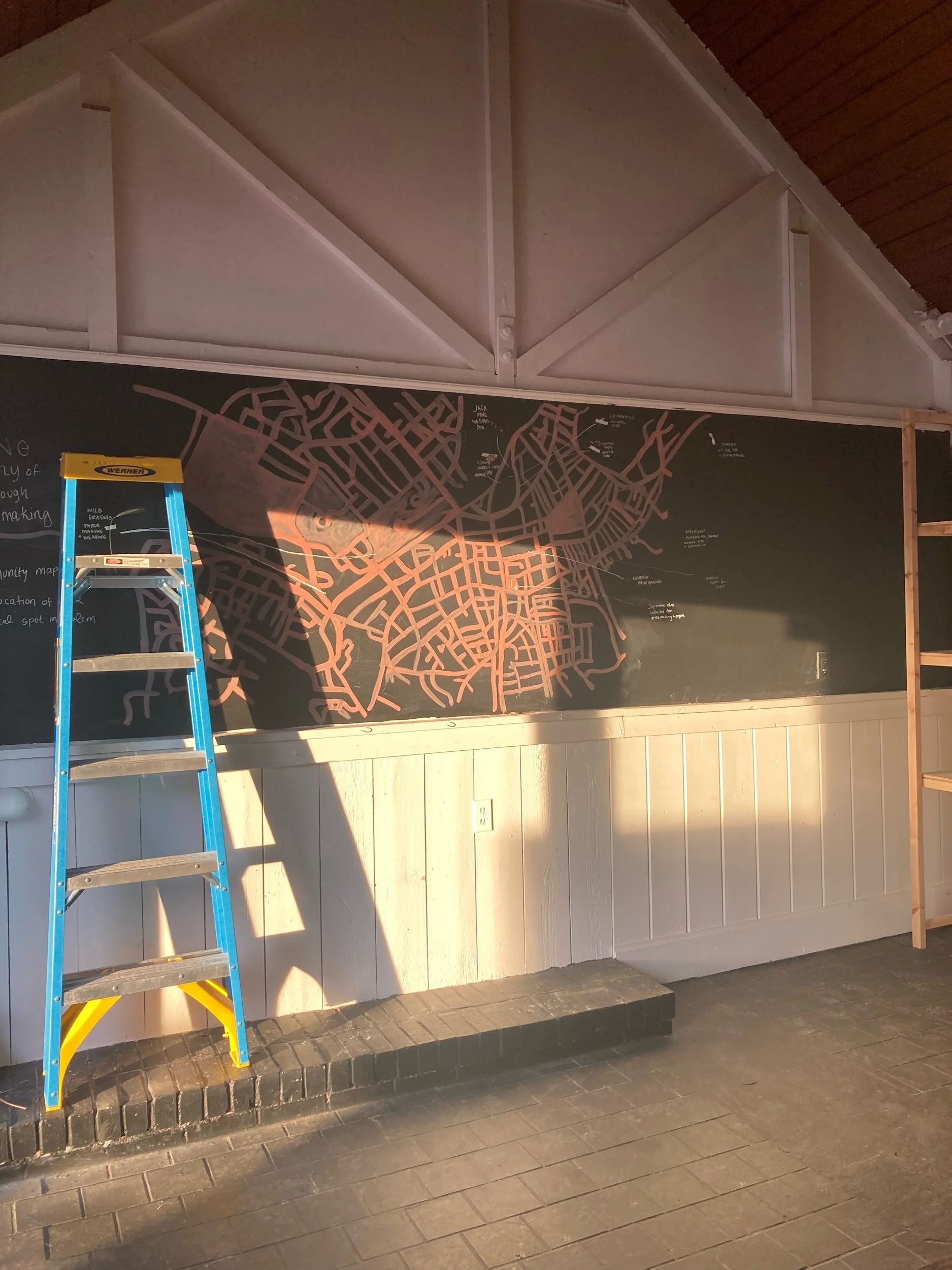 Wrapped up the residency and exhibit while moving into a new space and studio to share with my good friend and creative powerhouse Melodey Mathews of Melon Rose. Too excited to be moving into a new space so full of potential. This build out was completed in a true whirlwind of late nights and long hours, coffee and salt snacks. Lots of ladders and wood, trips to home depot, screws and paint. I was able to make four tables and almost all our shelving out of scrap wood from a wall in the shop that we took down. Mel’s dad hooked us up with all the lighting. And of course Maisie was a very helpful sidekick. Pictures in reverse from the last night in Old Town Hall cramming my car full of branches and an almost empty residency studio TO an evolving studio space. I’m already nostalgic.